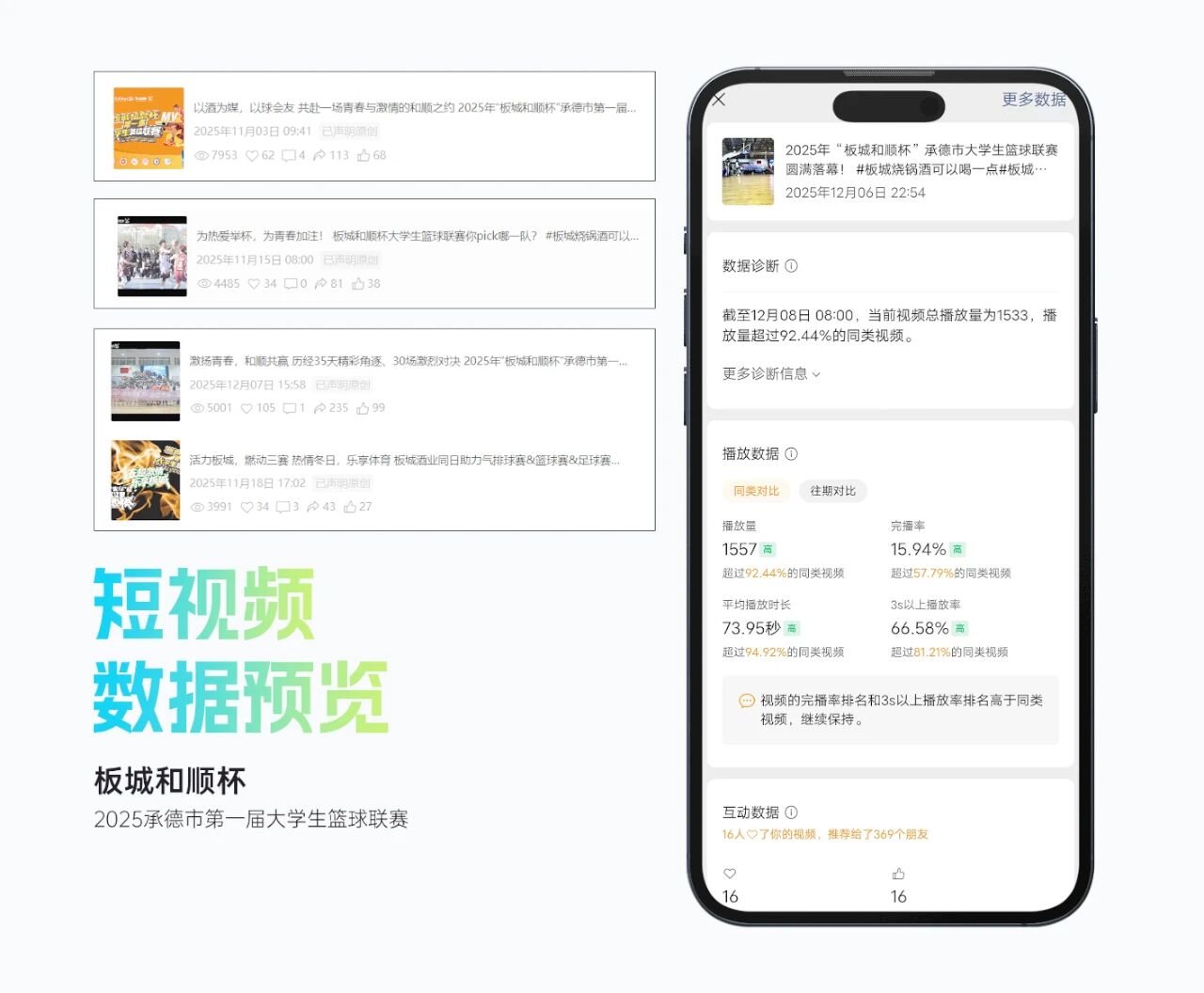 整體活動(dòng)影響力顯著,賽事抖音曝光超214萬,累計(jì)觀看直播人數(shù)超15萬人,現(xiàn)場(chǎng)累計(jì)吸引觀眾逾2萬人次,承德市籃球協(xié)會(huì)微信公眾號(hào)相關(guān)閱讀量超2萬人次,板城酒業(yè)視頻號(hào)平臺(tái)相關(guān)播放量超2.5萬人次。